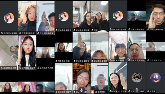四、重温入党誓词,面对鲜红的党旗,举起右拳宣誓。